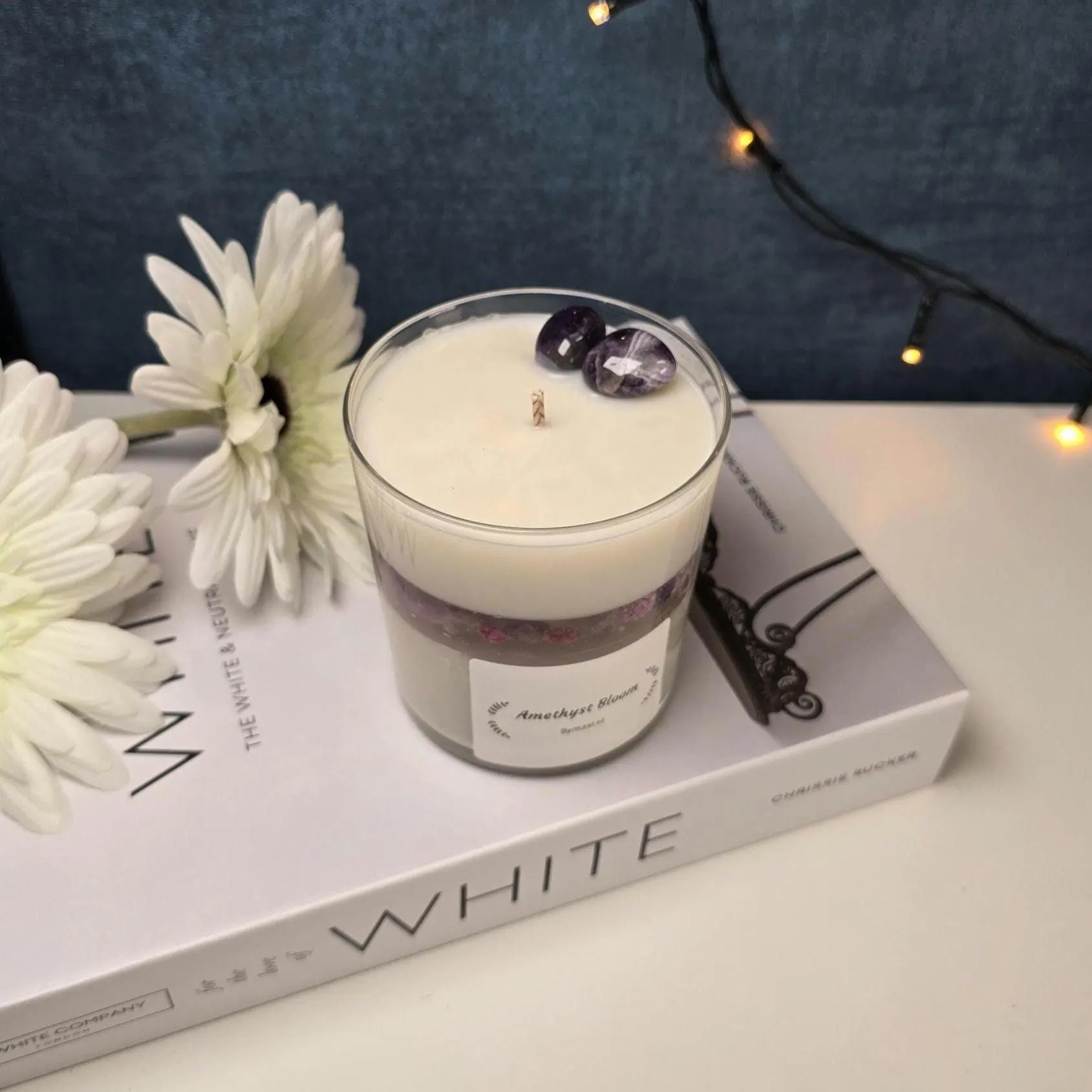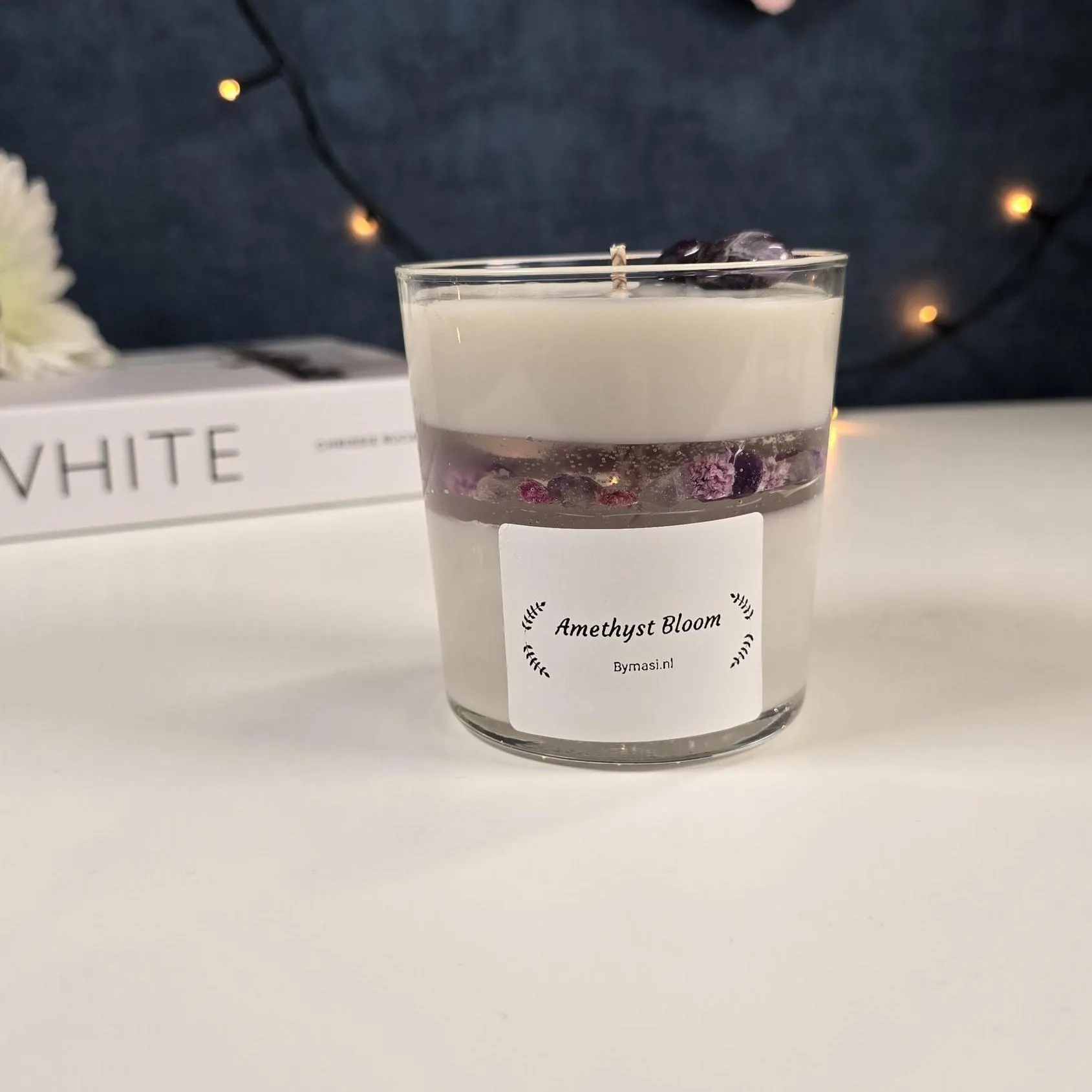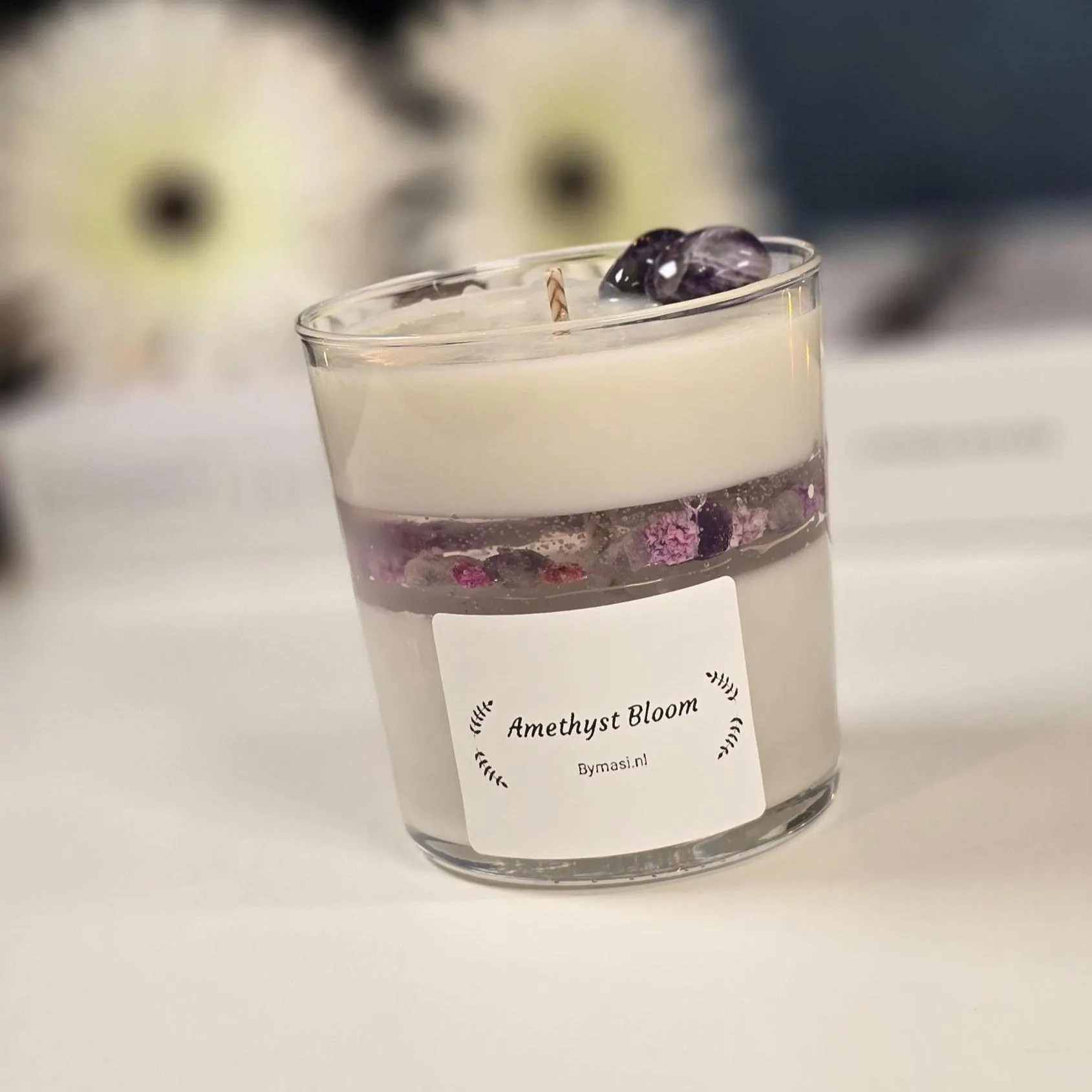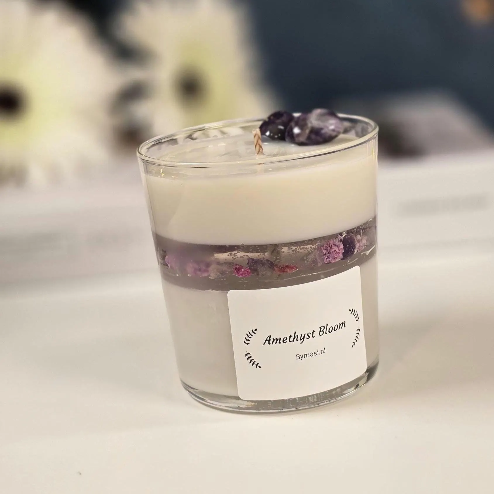 Bring peace and positive energy into your space with our handcrafted Amethyst Bloom Candle. This unique piece combines 100% natural soy wax with a clear layer of gel wax, revealing real dried flowers and natural amethyst stones.