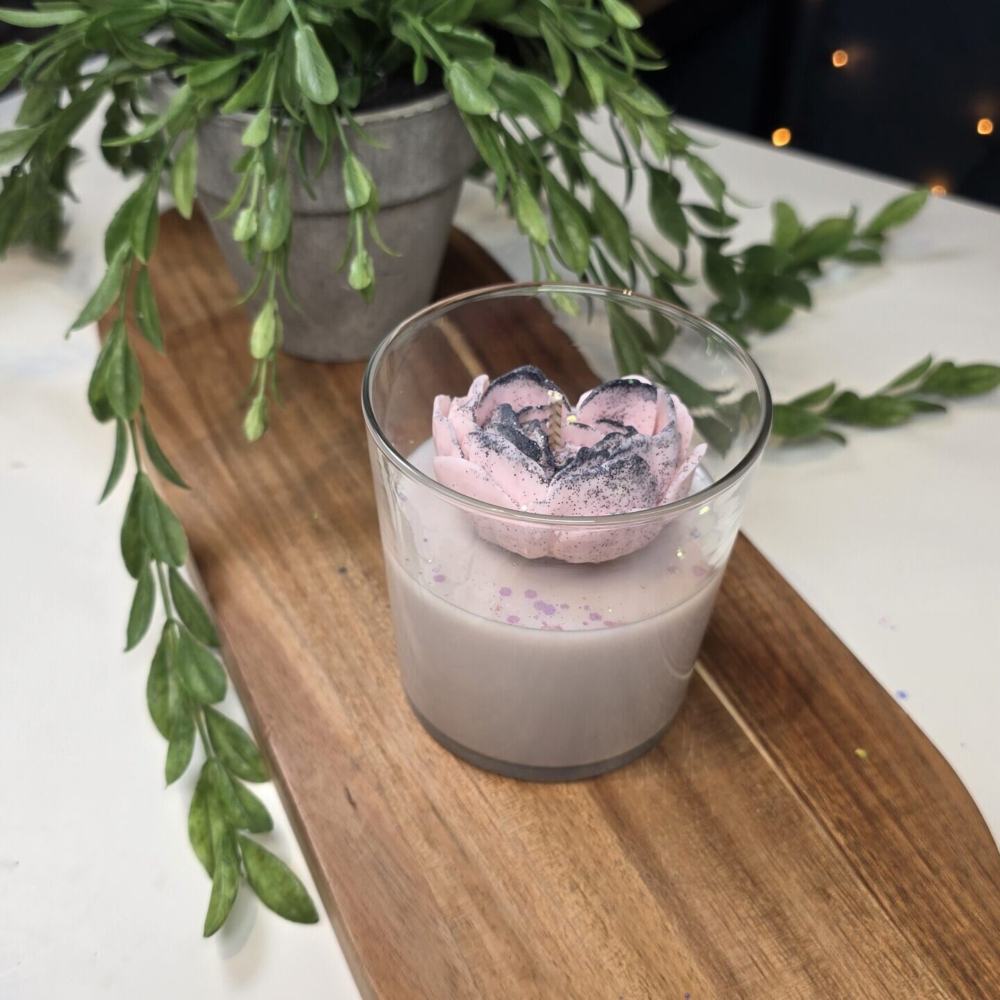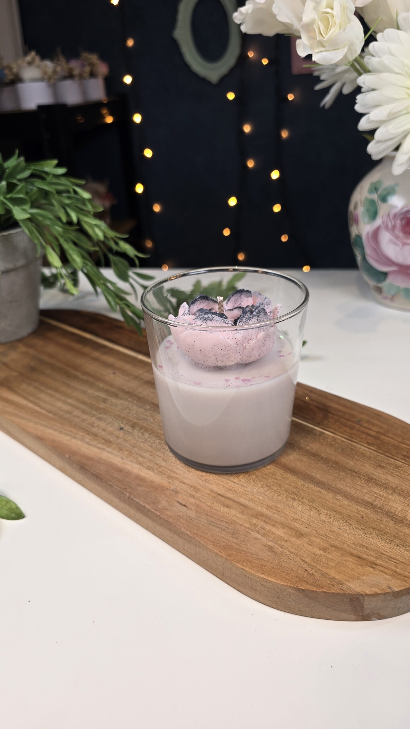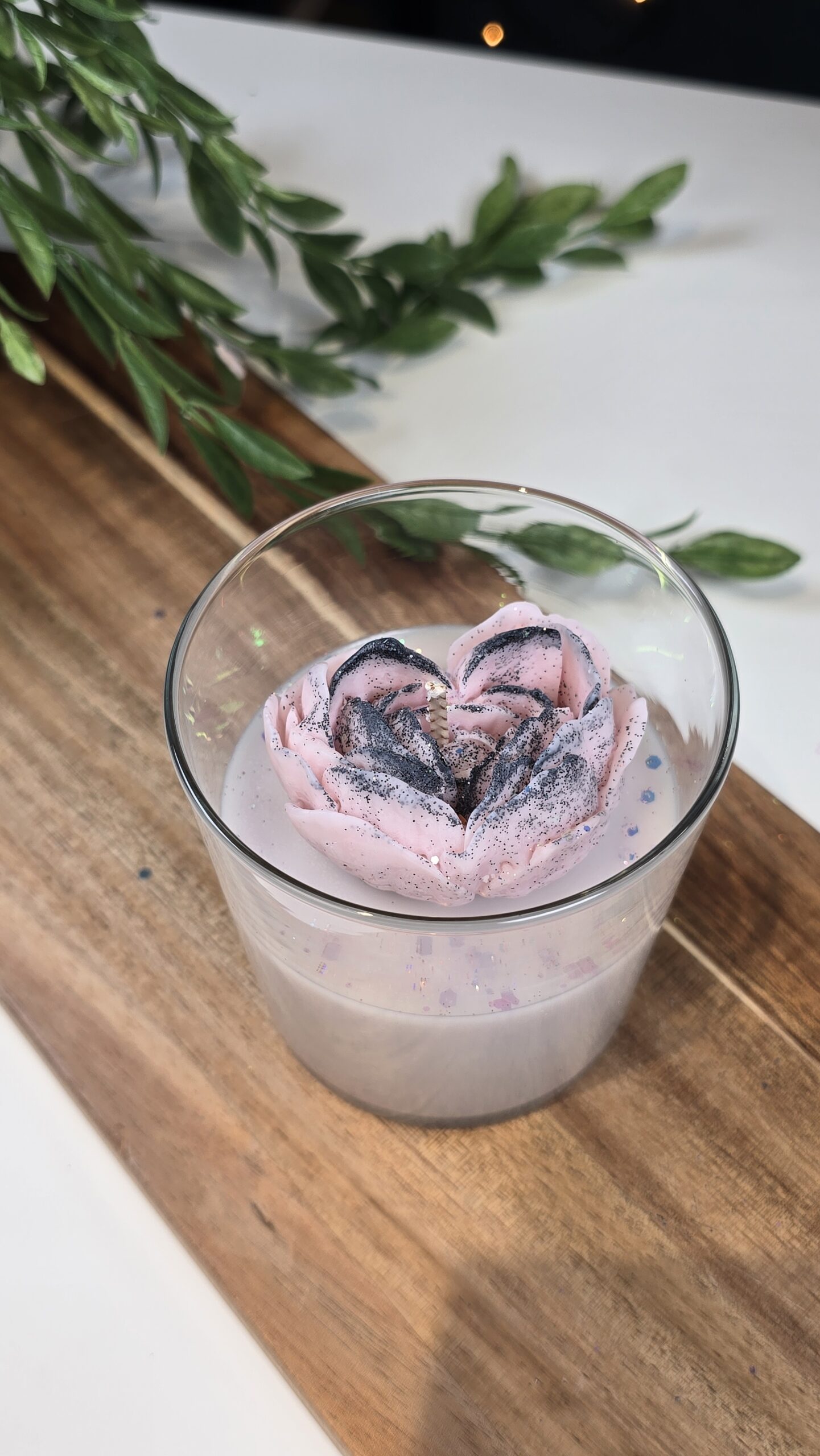 Each petal is detailed by hand and sprinkled with subtle glitter, making it not only a fragrant candle but also a beautiful decorative piece. Ideal as a gift for someone special or as a centerpiece for your home.