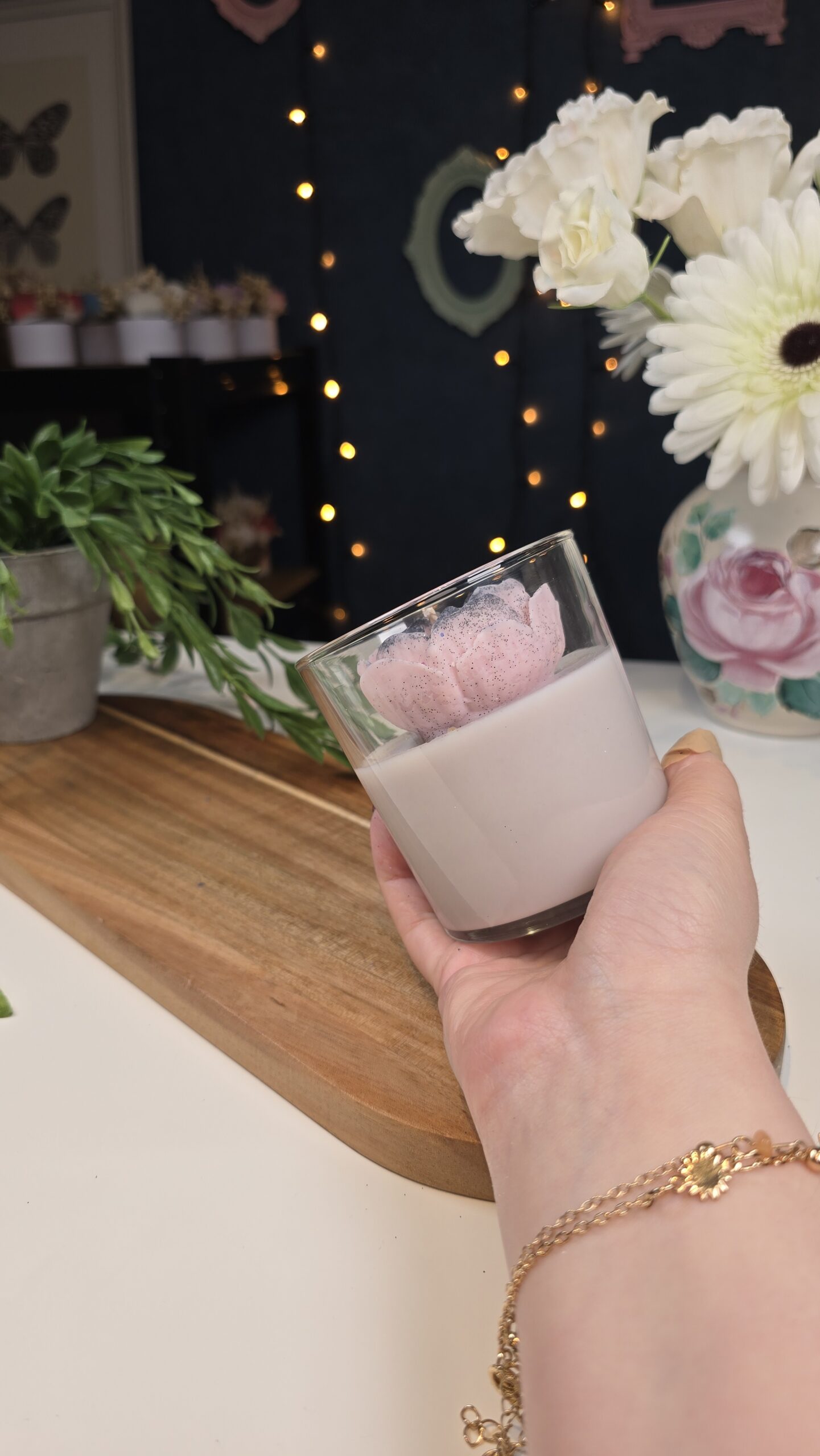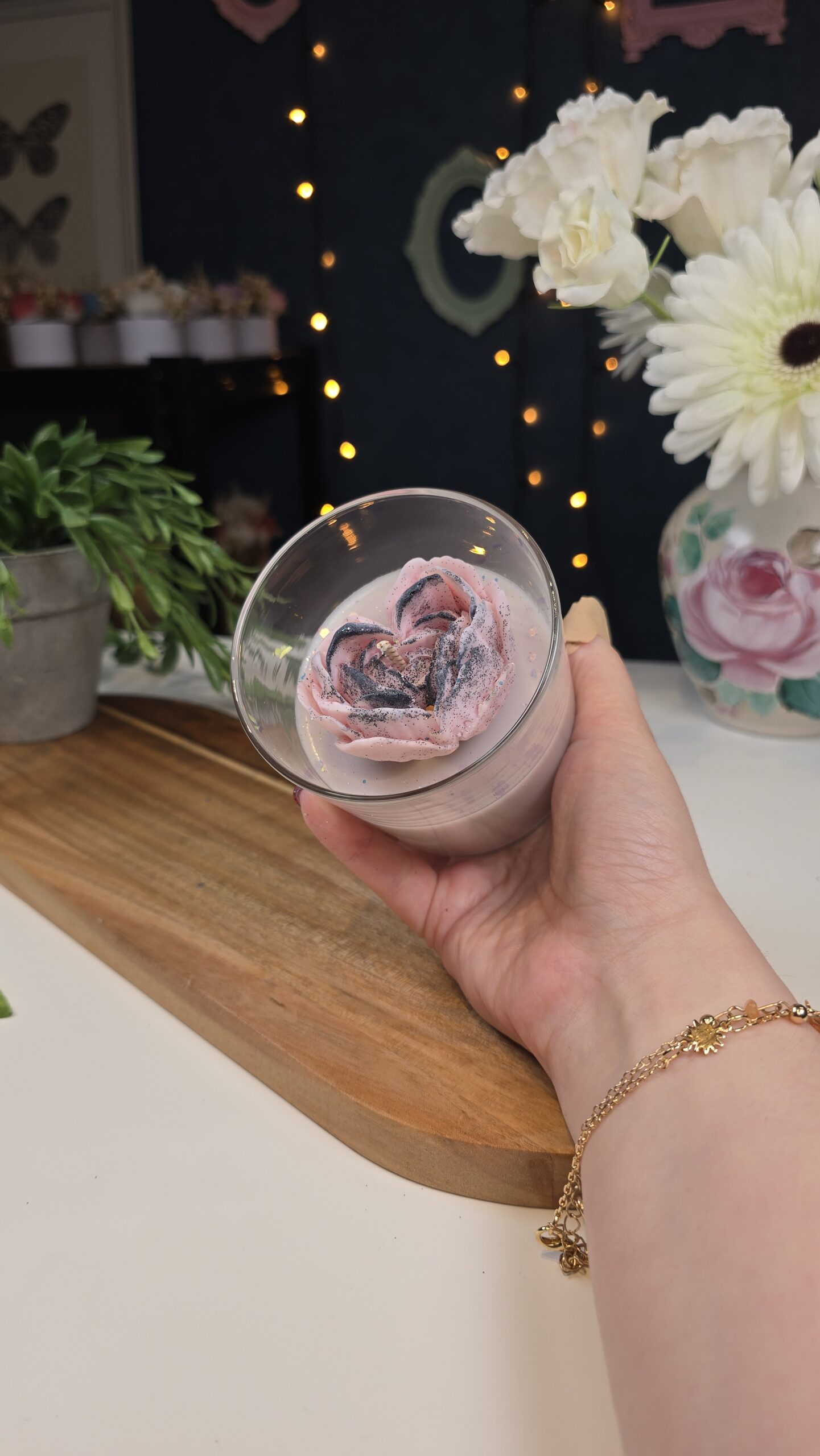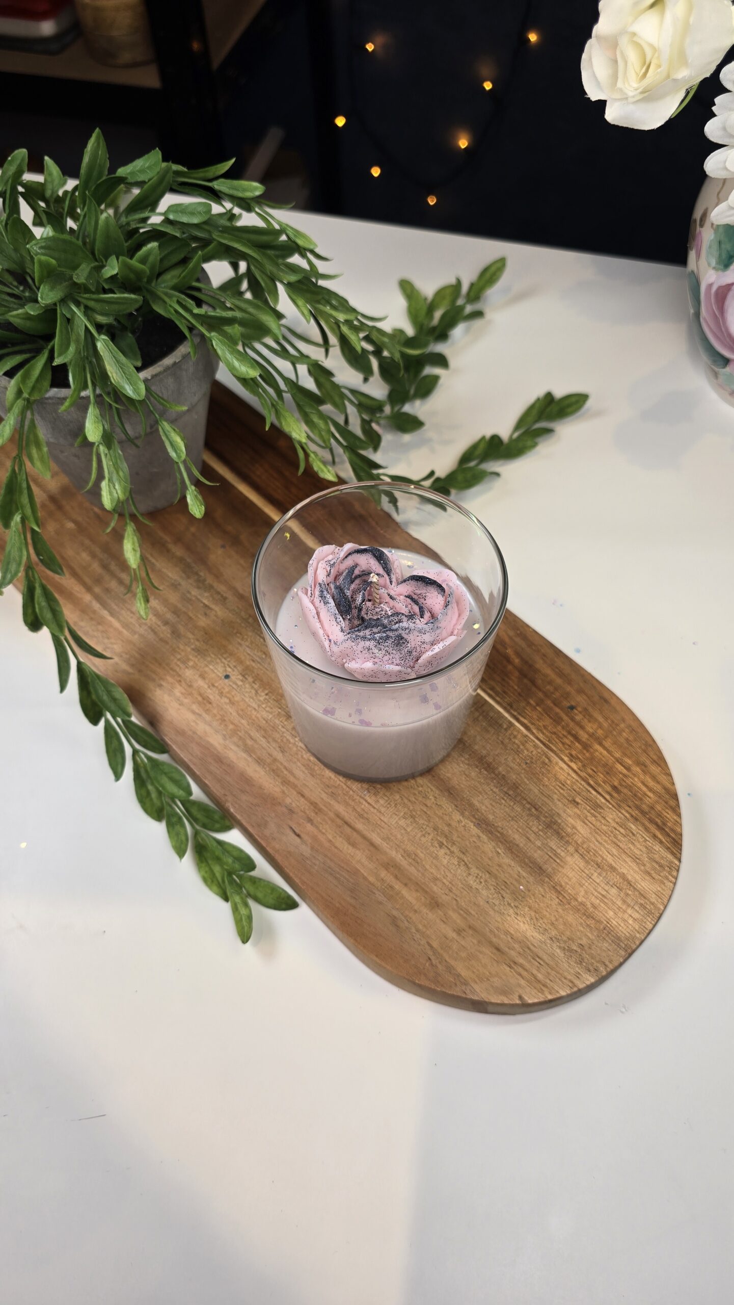 Each petal is detailed by hand and sprinkled with subtle glitter, making it not only a fragrant candle but also a beautiful decorative piece. Ideal as a gift for someone special or as a centerpiece for your home.