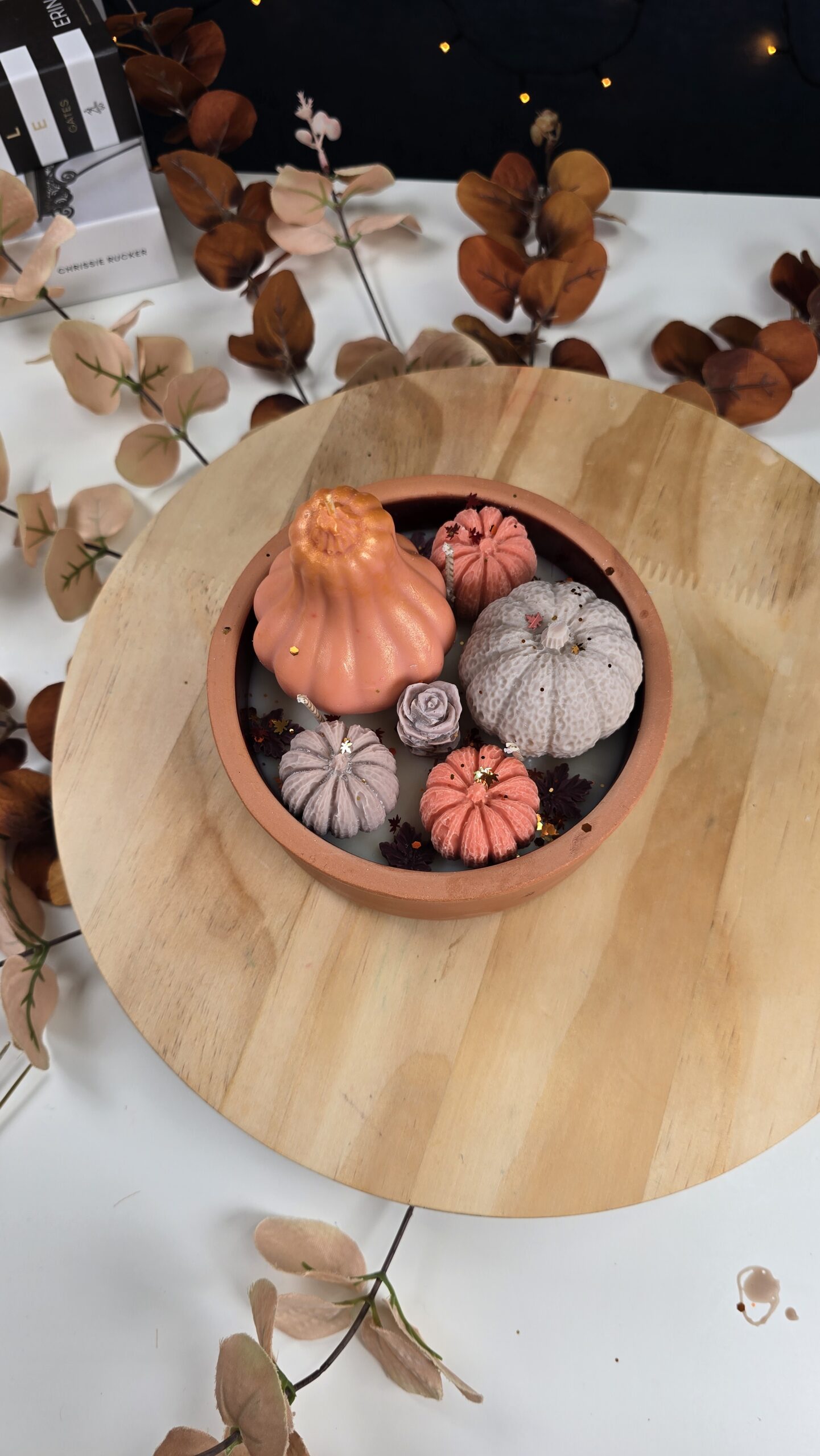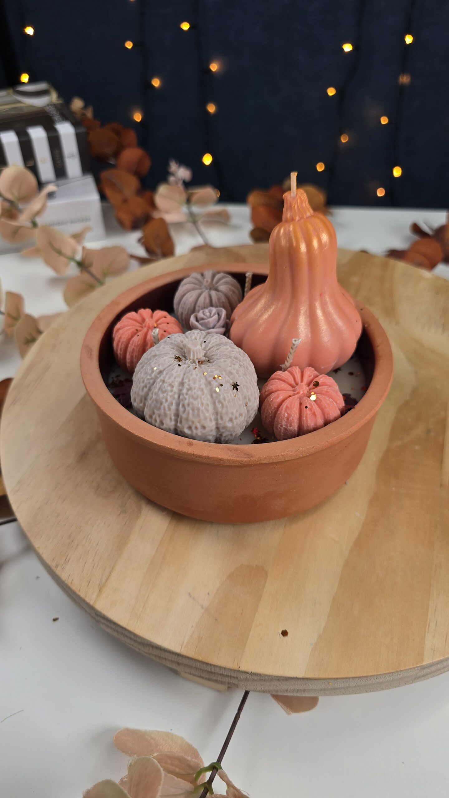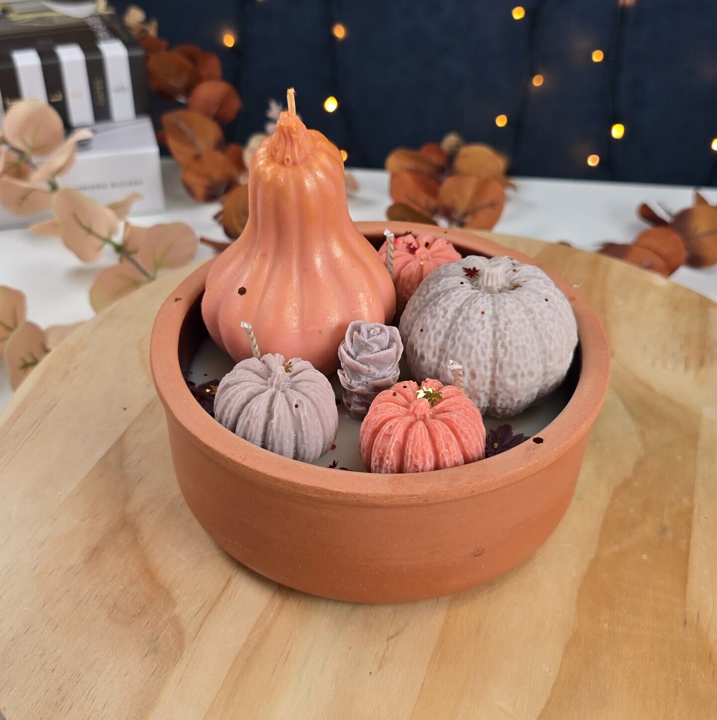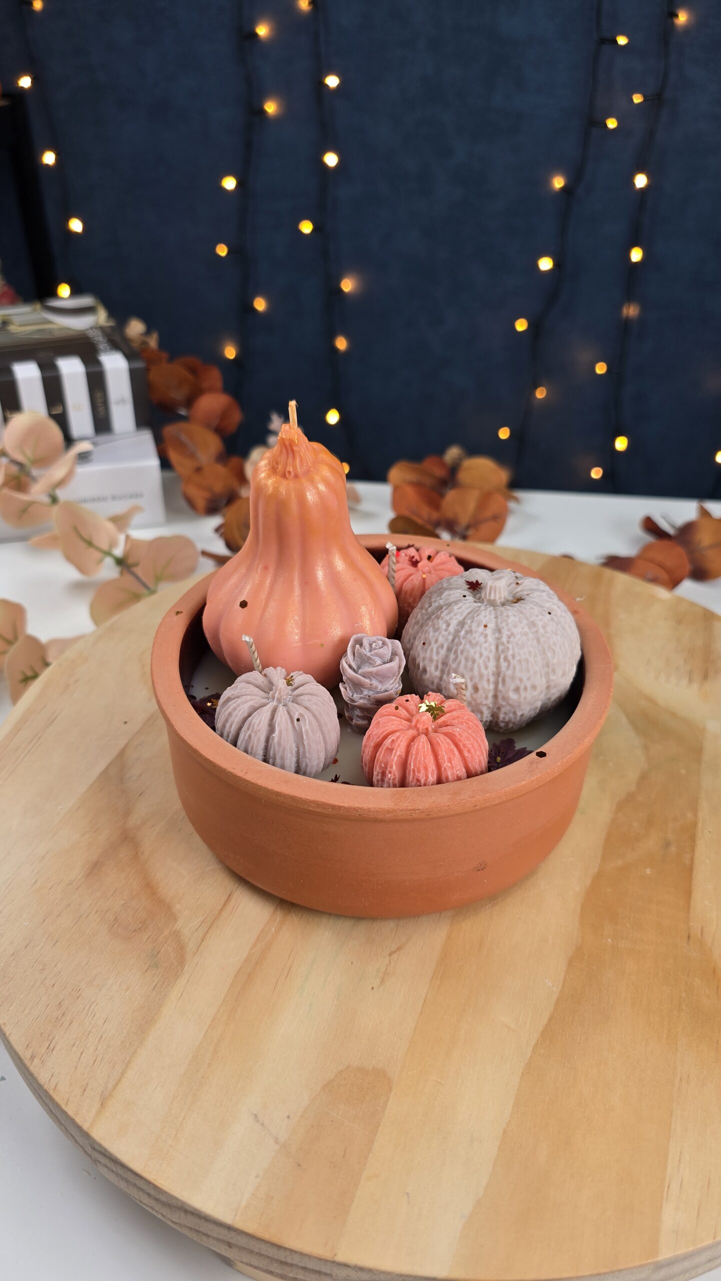 Add a warm autumn glow to your home with this stunning Pumpkin Candle Bowl, a handcrafted soy wax candle set arranged beautifully inside a rustic terracotta pot.Each bowl features a cozy mix of pumpkin-shaped candles and floral accents, making it a charming fall centerpiece or an unforgettable gift for pumpkin lovers.