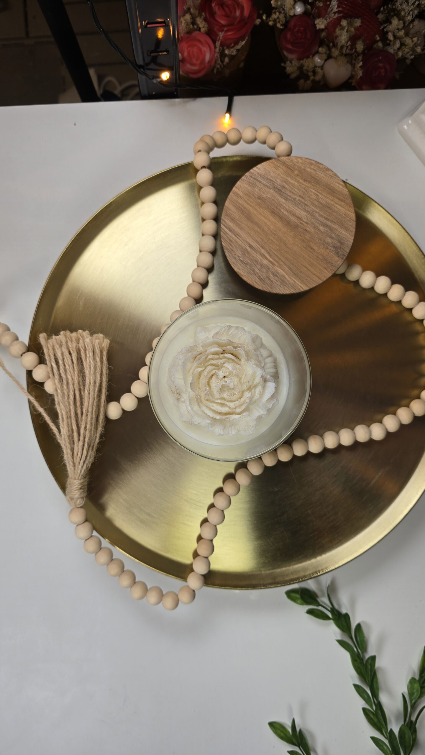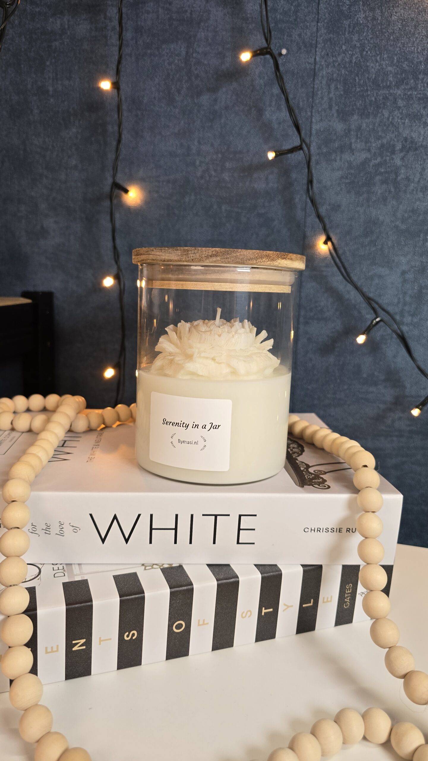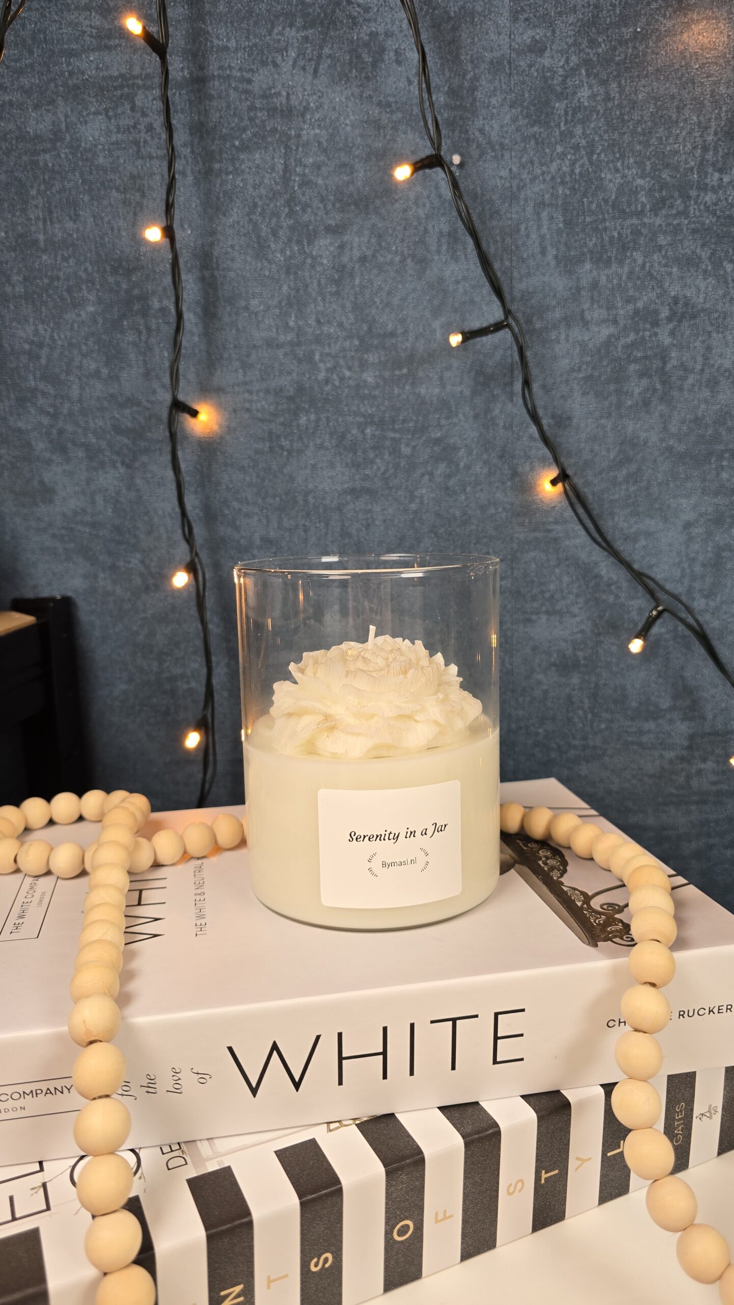 Elevate your space with the calming charm of our “Serenity in a Jar” candle. Hand-poured with 100% natural soy wax into a sleek glass jar, this minimalist piece features a delicately crafted white flower nestled in the center – a symbol of peace, purity, and elegance.